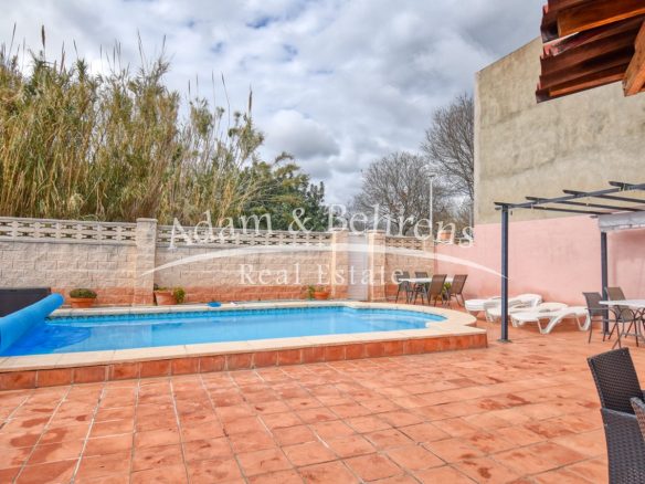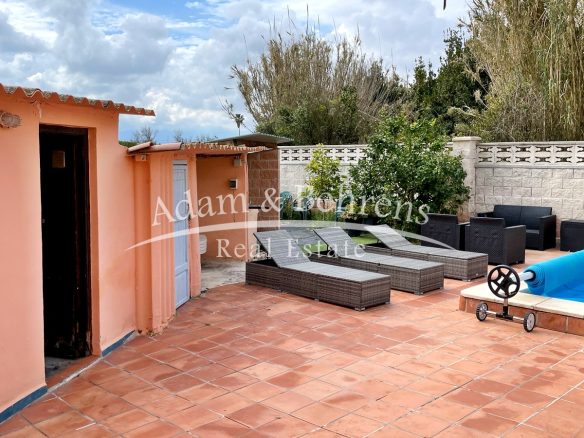 La propiedad se extiende sobre dos unidades residenciales separadas, cada una con su propia puerta de entrada, además de amplias zonas exteriores con terraza soleada y piscina. El apartamento de la planta baja cuenta con una sala de estar/comedor abierta con cocina abierta, dos dormitorios y un cuarto de baño con bañera y ducha. La unidad residencial superior cuenta con 3 dormitorios, sala de estar/comedor y cocina, así como un cuarto de baño con ducha.