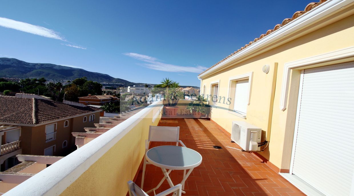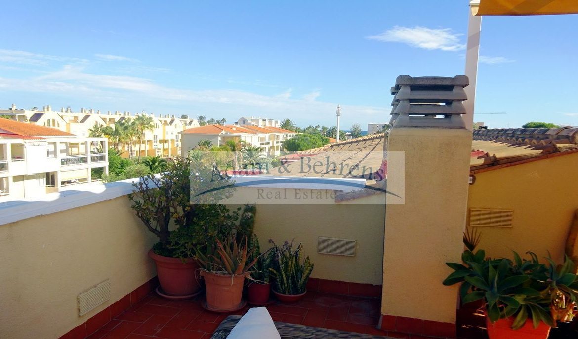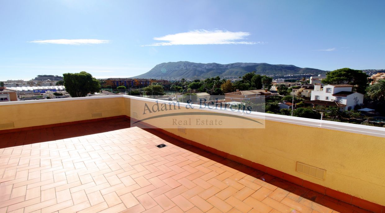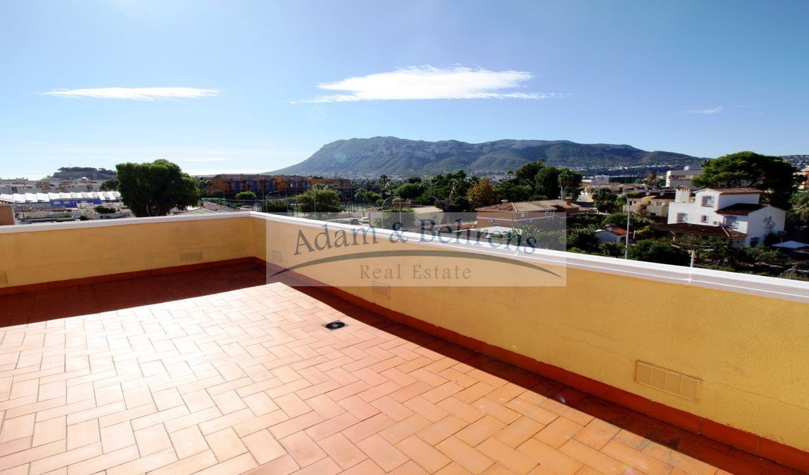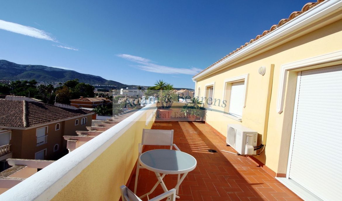 El «Atico Cuatro Soles» es una absoluta rareza entre las propiedades que se ofrecen en la zona de Denia. Un total de cuatro terrazas garantizan que pueda disfrutar del sol o de la sombra, de las vistas a las montañas o de la amplia zona comunitaria con piscina en cualquier momento. Desde la terraza principal también se puede ver el mar.