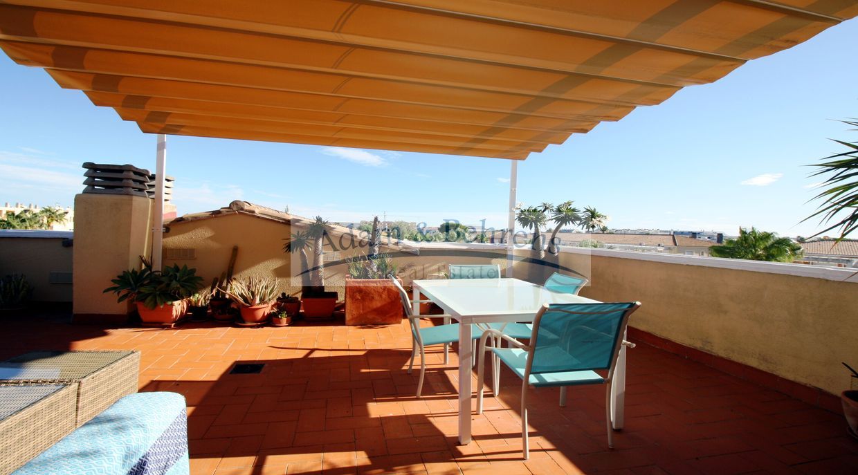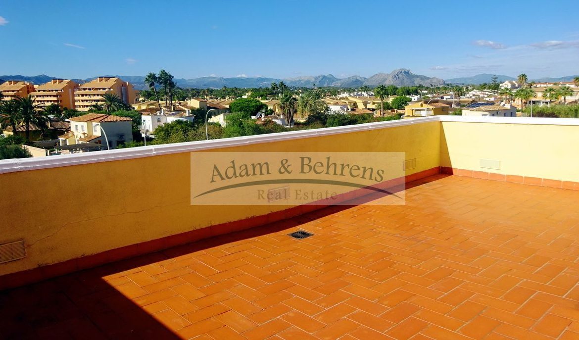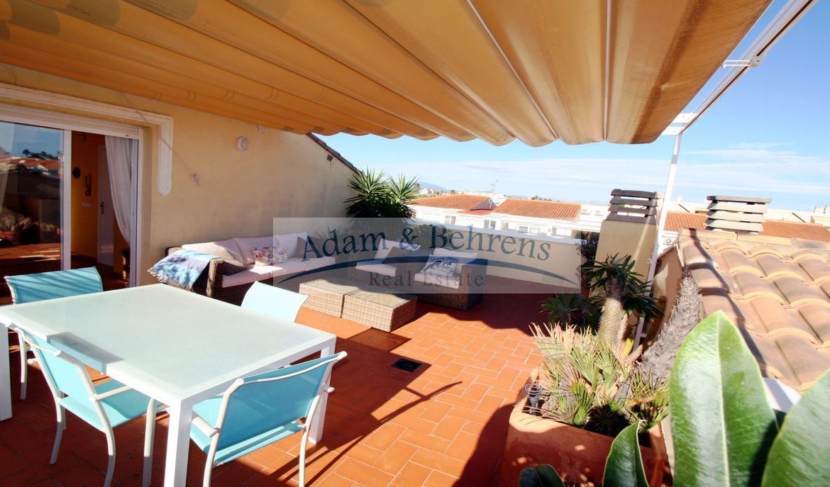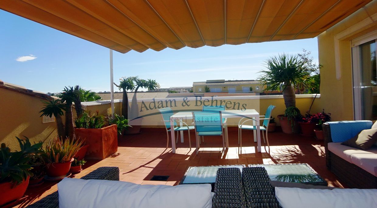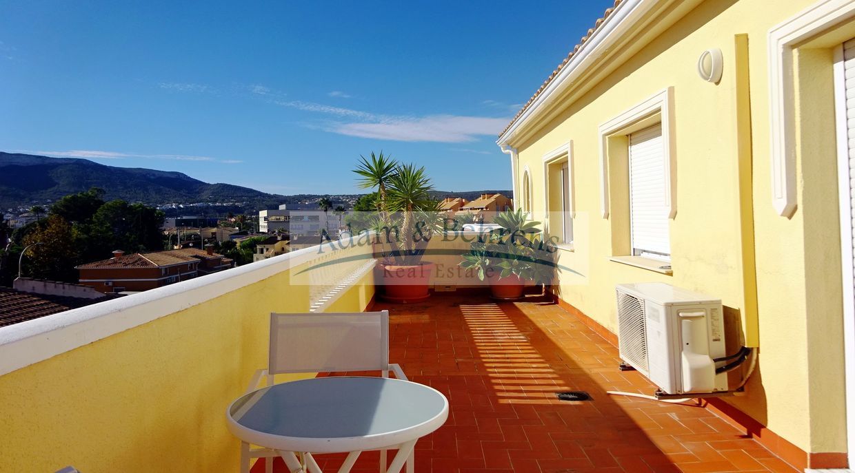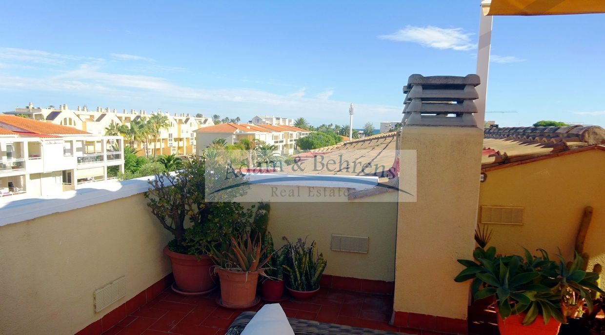 El «Atico Cuatro Soles» es una absoluta rareza entre las propiedades que se ofrecen en la zona de Denia. Un total de cuatro terrazas garantizan que pueda disfrutar del sol o de la sombra, de las vistas a las montañas o de la amplia zona comunitaria con piscina en cualquier momento. Desde la terraza principal también se puede ver el mar.