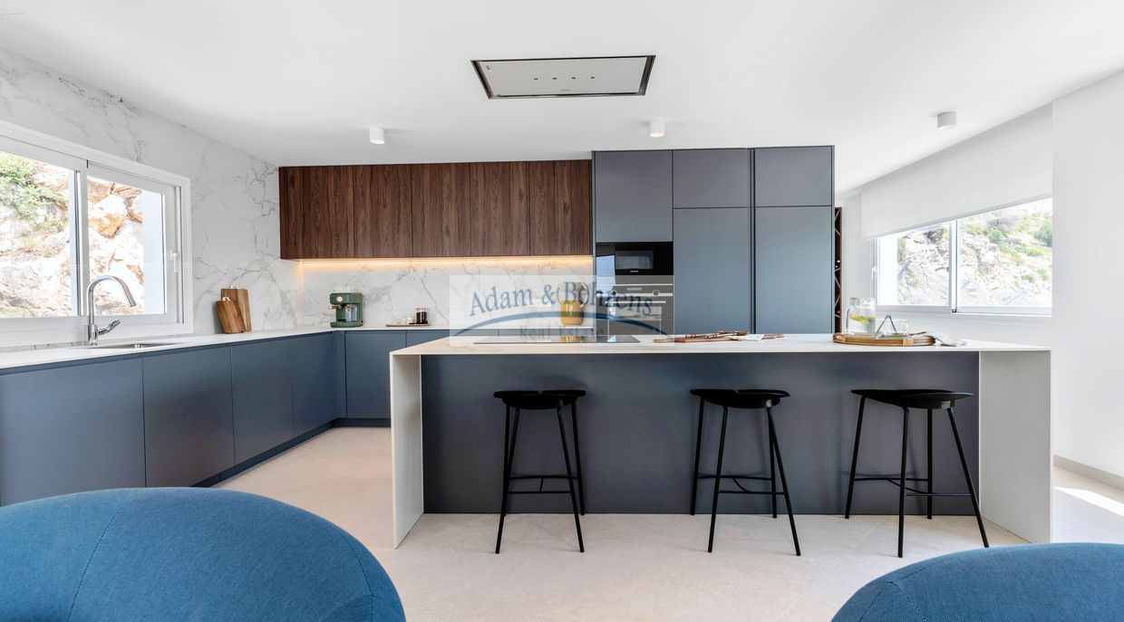Offene Küche mit zentraler Insel, die Koch- und Frühstücksbereiche kombiniert. Voll ausgestattet mit Bosch-Geräten (Kühlschrank , Induktionskochfeld, Backofen, Mikrowelle, Dunstabzugshaube, Geschirrspüler und Waschmaschine).