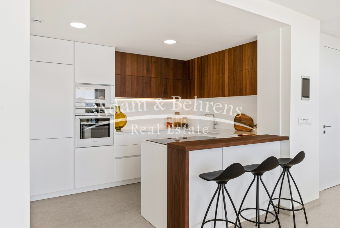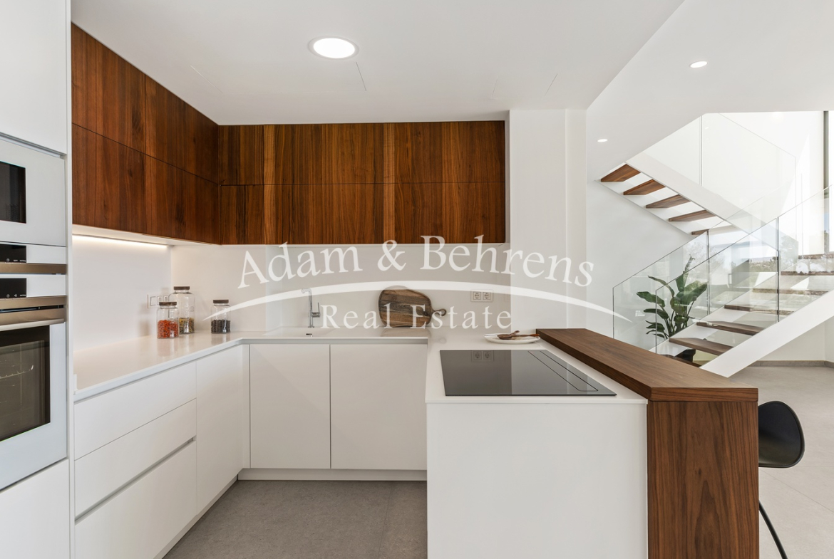 Der Hauptwohnbereich ist durch den Treppengang in zwei Bereiche unterteilt. Auf der einen Seite liegt das vierte Schlafzimmer mit eigenem Bad, eingebautem Kleiderschrank und Zugang zur Hauptterrasse mit Veranda. Auf der anderen Seite gibt es eine Gästetoilette und die zum Essraum hin offene Küche mit einer Kochinsel, die auch Platz zum Frühstücken bietet und über einen Zugang zur Veranda verfügt.
