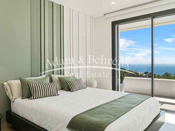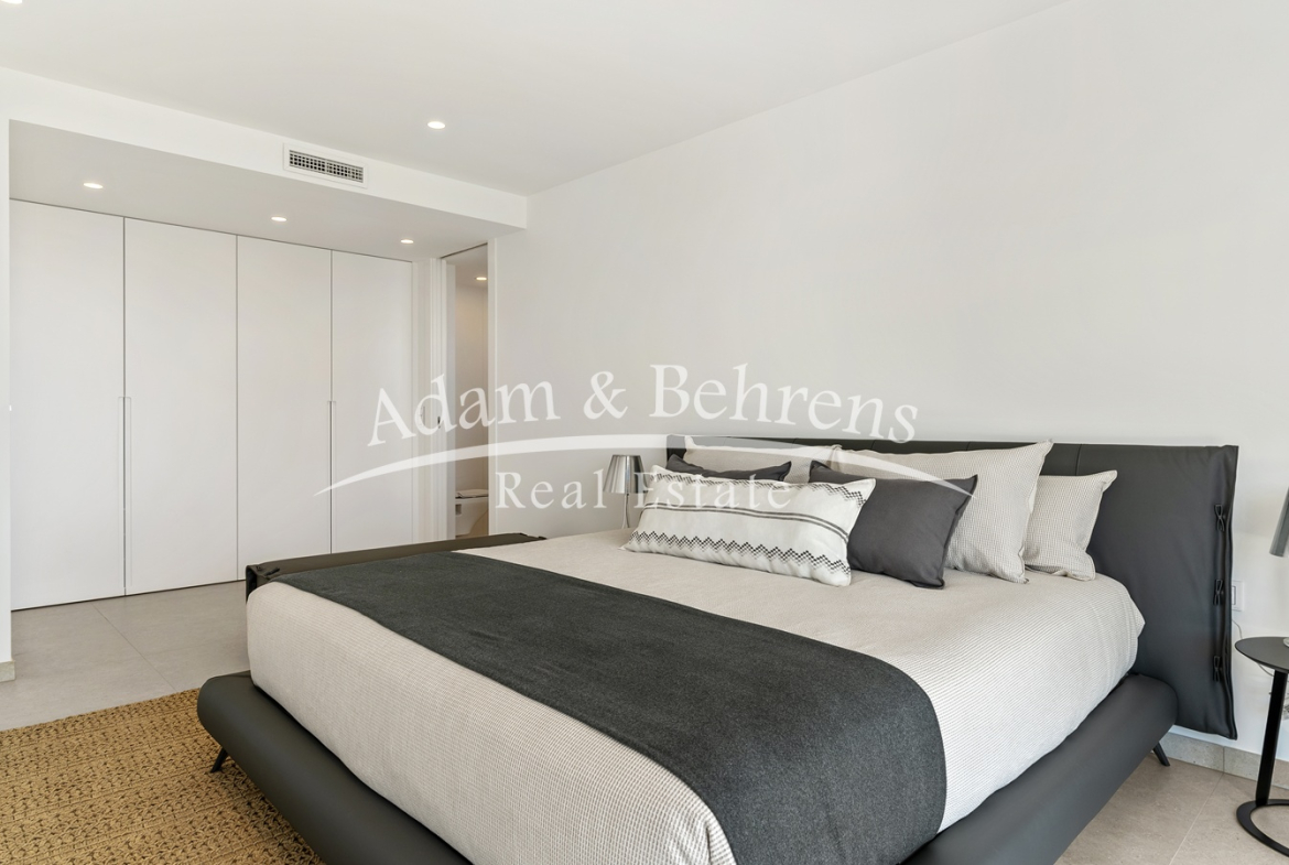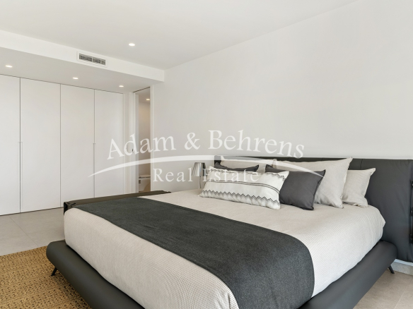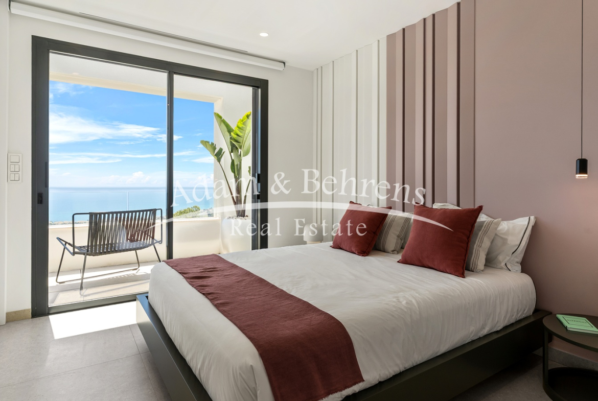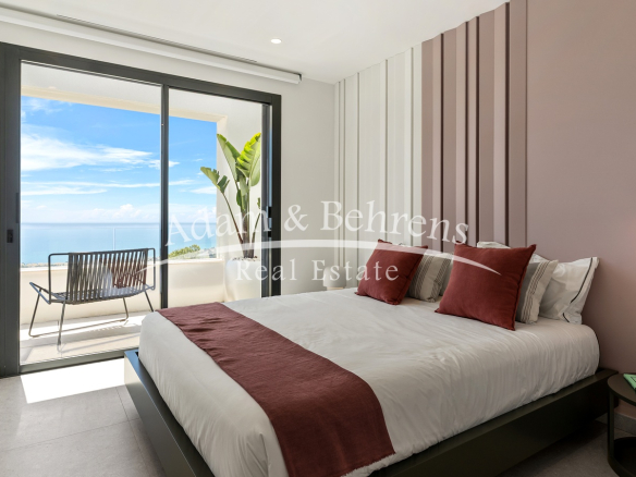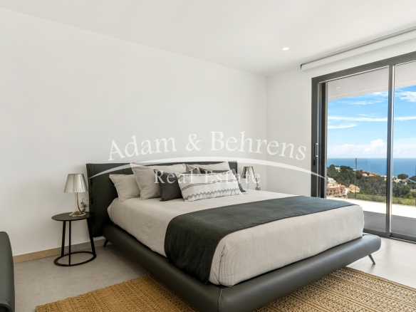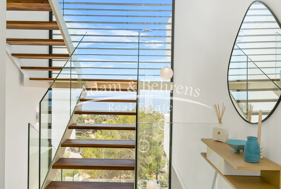 In der obersten Etage befindet sich eine Doppelgarage und die Eingangshalle, die alle Stockwerke miteinander verbindet. Im mittleren Bereich liegen drei der vier Schlafzimmer. Dabei ist das Hauptschlafzimmer so ausgerichtet, dass es einen wunderschönen Blick auf das Meer bietet. Es hat Zugang zu einer privaten Terrasse, ein eigenes Bad und einen eingebauten Kleiderschrank. Die beiden anderen Schafzimmer teilen sich eine Terrasse und haben ebenfalls ein Bad en Suite sowie geräumige Kleiderschränke.