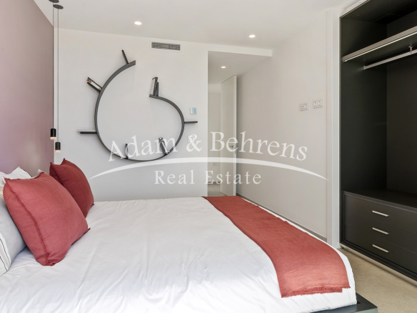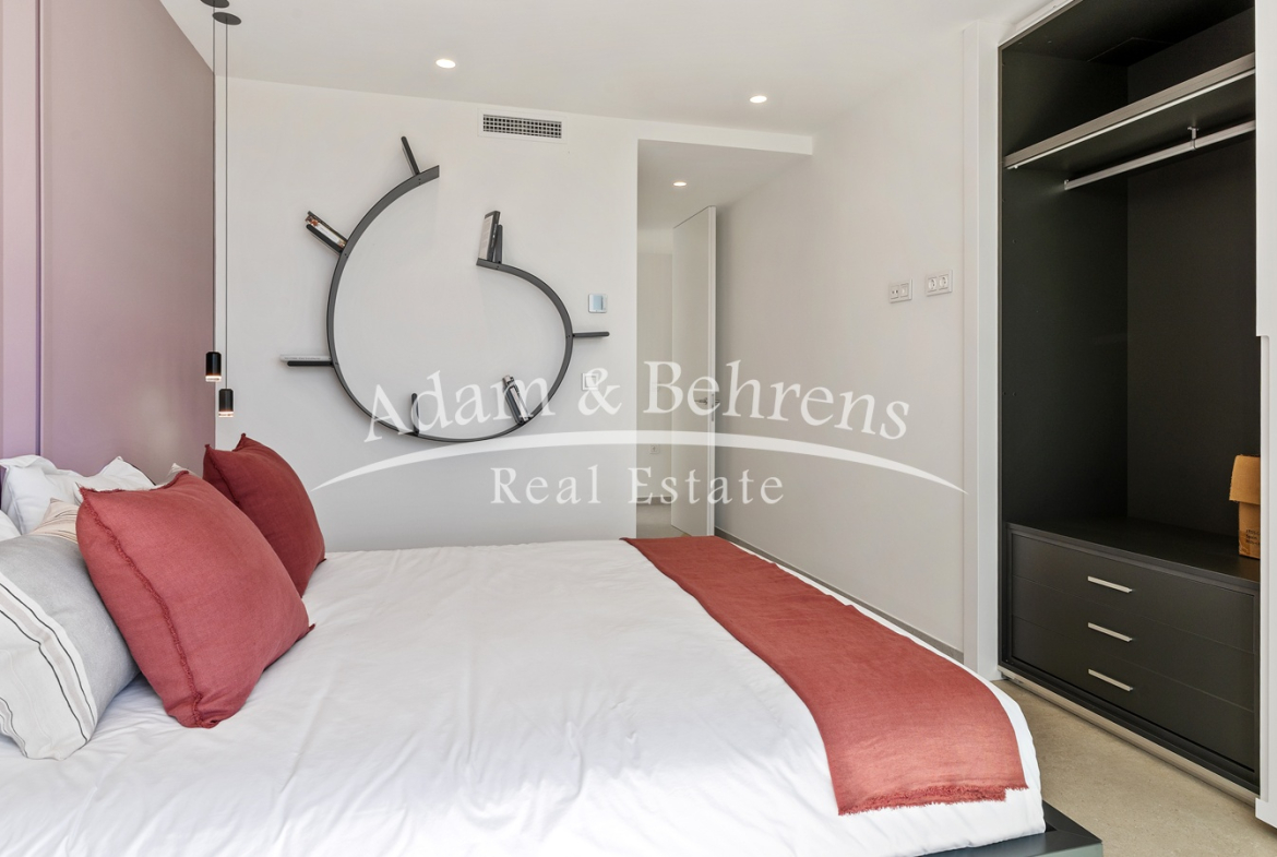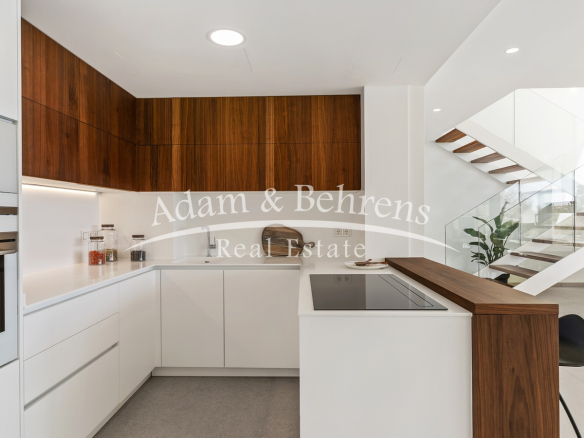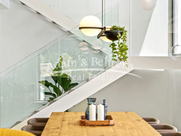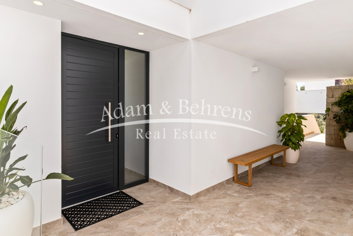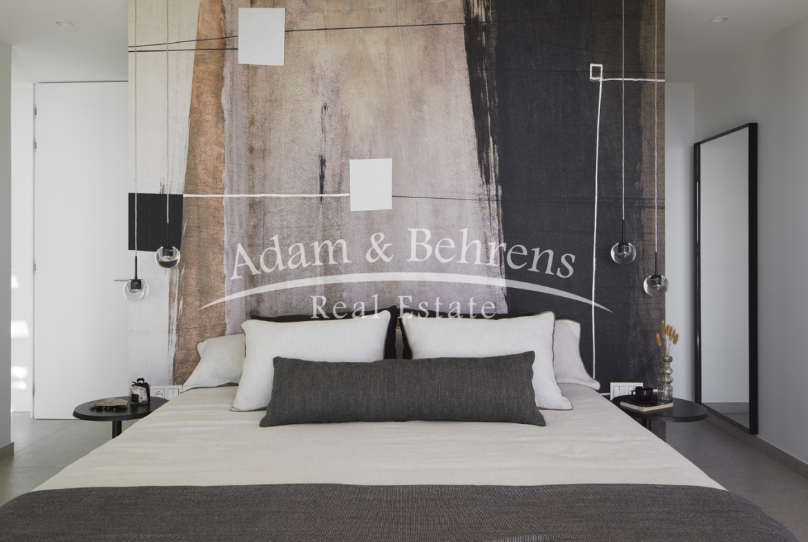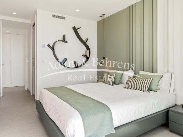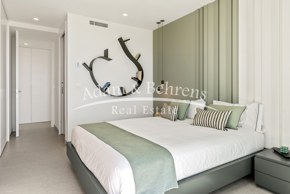 In der obersten Etage befindet sich eine Doppelgarage und die Eingangshalle, die alle Stockwerke miteinander verbindet. Im mittleren Bereich liegen drei der vier Schlafzimmer. Dabei ist das Hauptschlafzimmer so ausgerichtet, dass es einen wunderschönen Blick auf das Meer bietet. Es hat Zugang zu einer privaten Terrasse, ein eigenes Bad und einen eingebauten Kleiderschrank. Die beiden anderen Schafzimmer teilen sich eine Terrasse und haben ebenfalls ein Bad en Suite sowie geräumige Kleiderschränke.