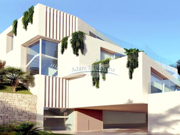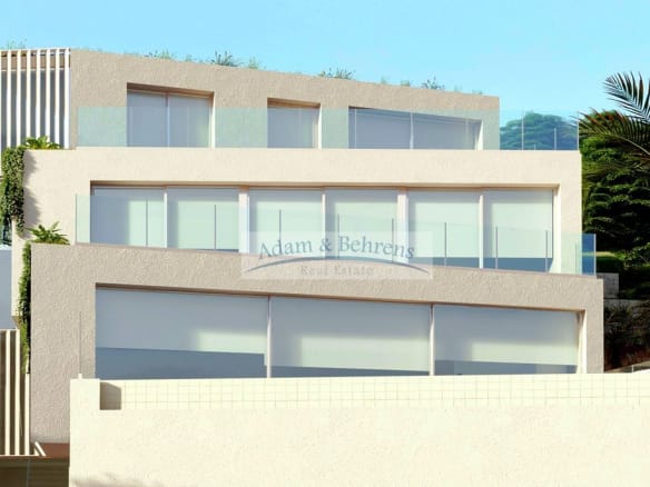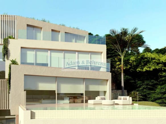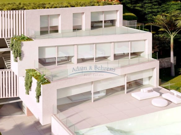 Im großzügigen Erdgeschoß teilt sich auf in ein geräumiges Wohn-Esszimmer mit Panoramafenster, die Küche mit integrierter Insel, ein Gäste-WC sowie die Terrasse mit Pool. Im ersten Stock befinden sich drei Schlafzimmer. Alle Schlafzimmer haben Zugang zu einer gemeinschaftlichen Aussichtsterrasse und ein eigenes Bad en Suite. Im zweiten Stock liegt die Master-Suite mit einem roßen Ankleidezimmer, einem geräumigen Badezimmer und einer großzügigen Terrasse mit spektakulärem Blick auf die Küste.