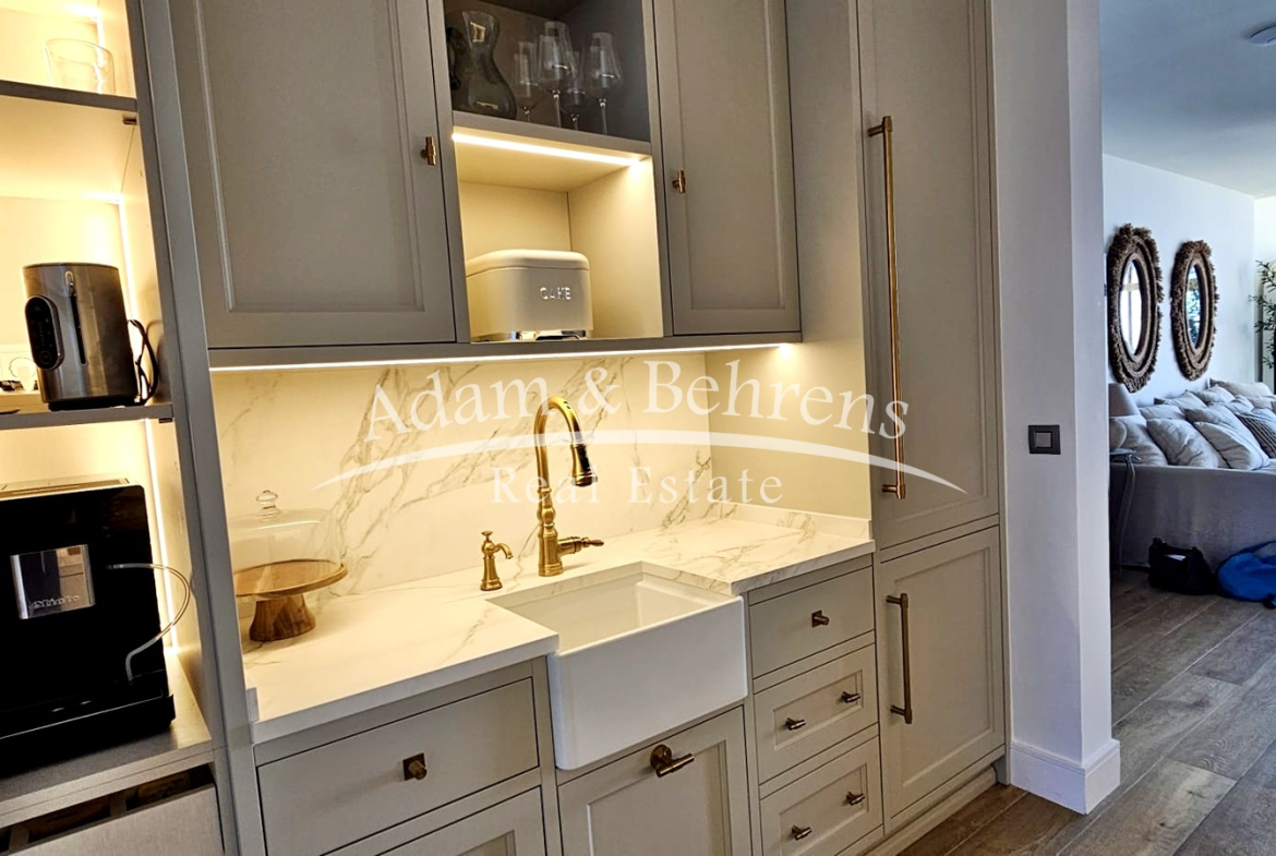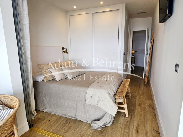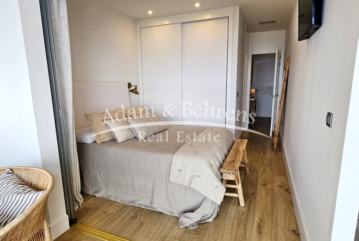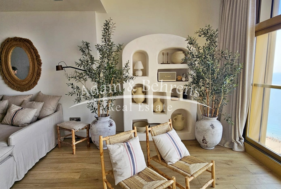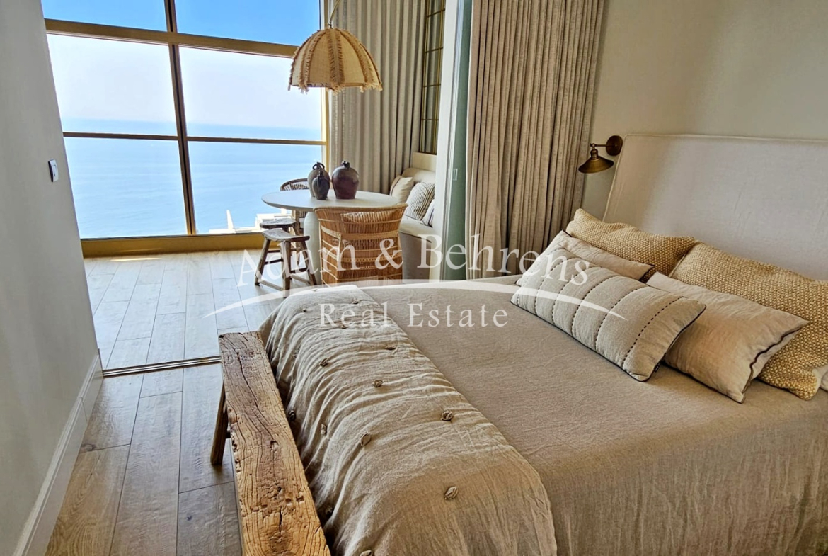 Das Apartment bietet zwei Schlafzimmer, zwei elegante Badezimmer, einen großzügigen Wohn- und Essbereich sowie eine voll ausgestattete Designküche mit hochwertigen Geräten und edlen Materialien. Durch großflächige Schiebetüren lässt sich der Wohnbereich in eine offene Terrasse verwandeln – perfekt, um das mediterrane Lebensgefühl zu genießen.