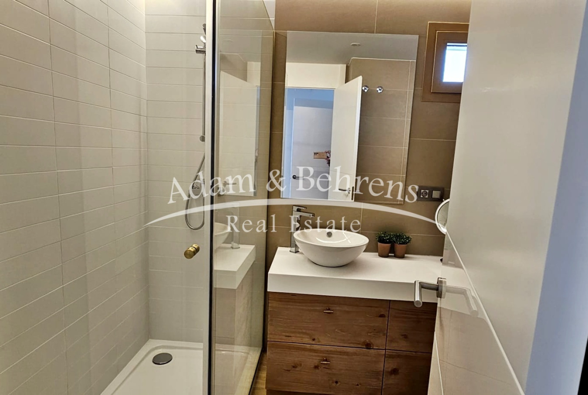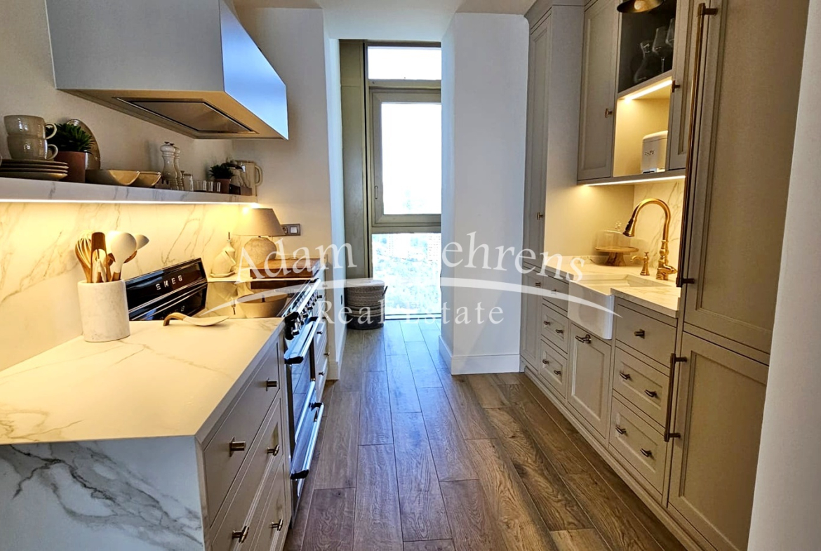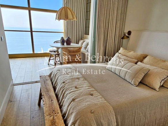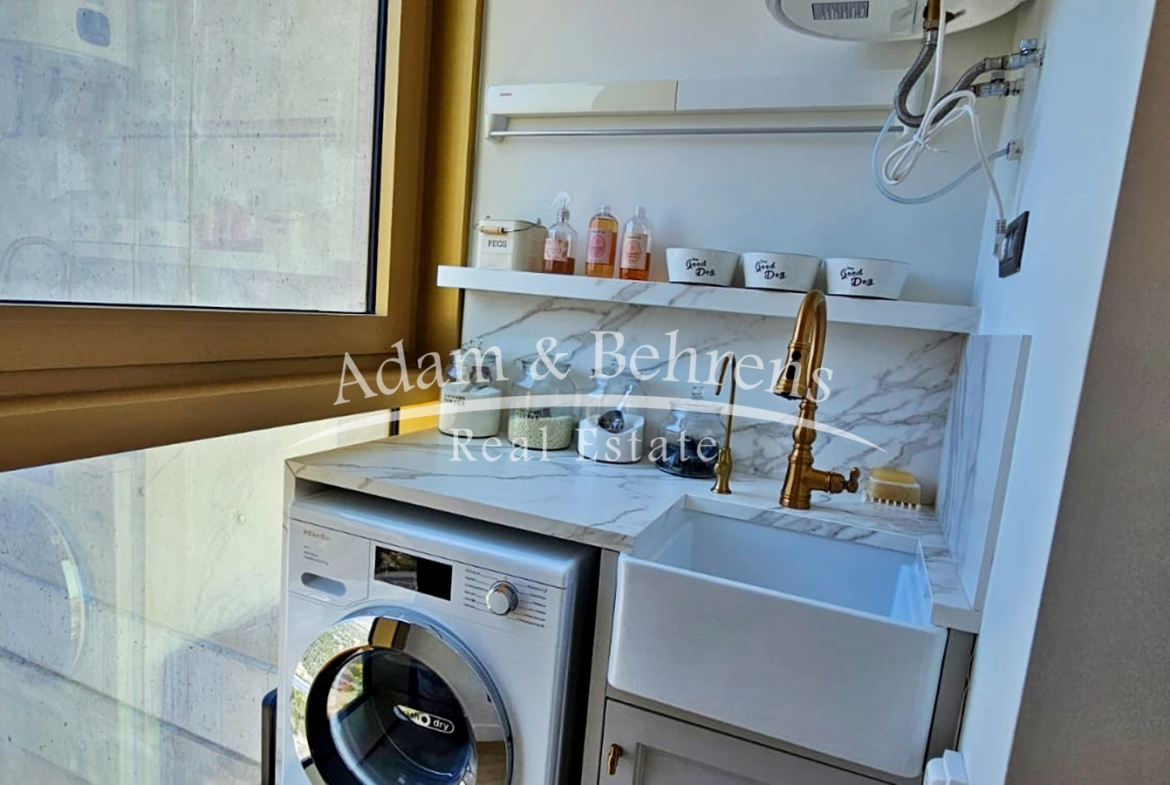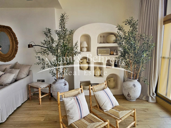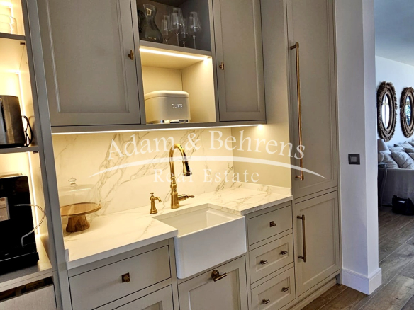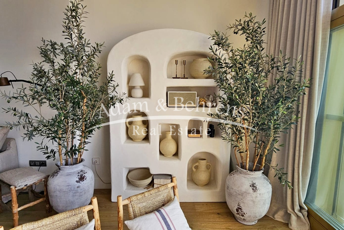 Das Apartment bietet zwei Schlafzimmer, zwei elegante Badezimmer, einen großzügigen Wohn- und Essbereich sowie eine voll ausgestattete Designküche mit hochwertigen Geräten und edlen Materialien. Durch großflächige Schiebetüren lässt sich der Wohnbereich in eine offene Terrasse verwandeln – perfekt, um das mediterrane Lebensgefühl zu genießen.