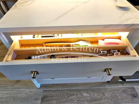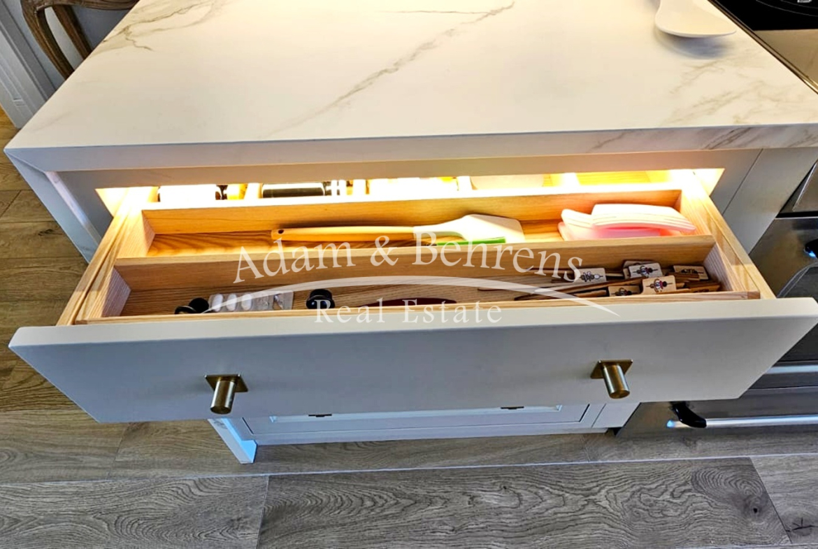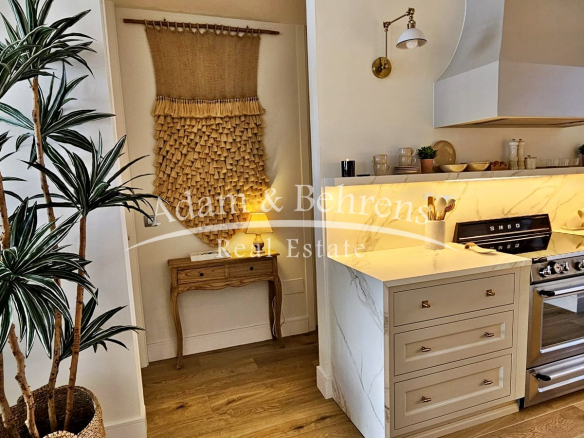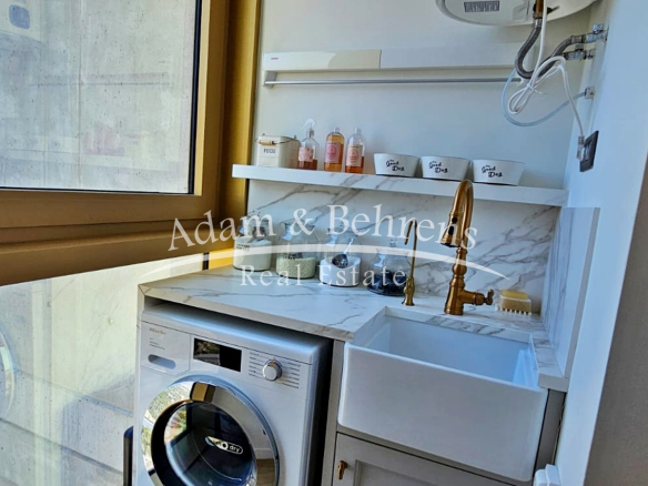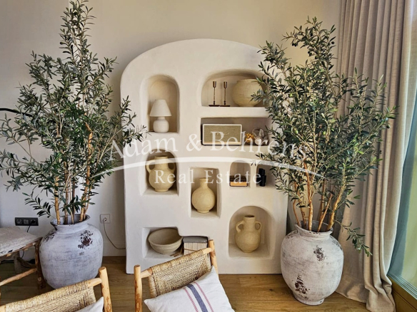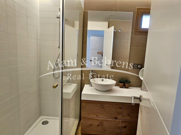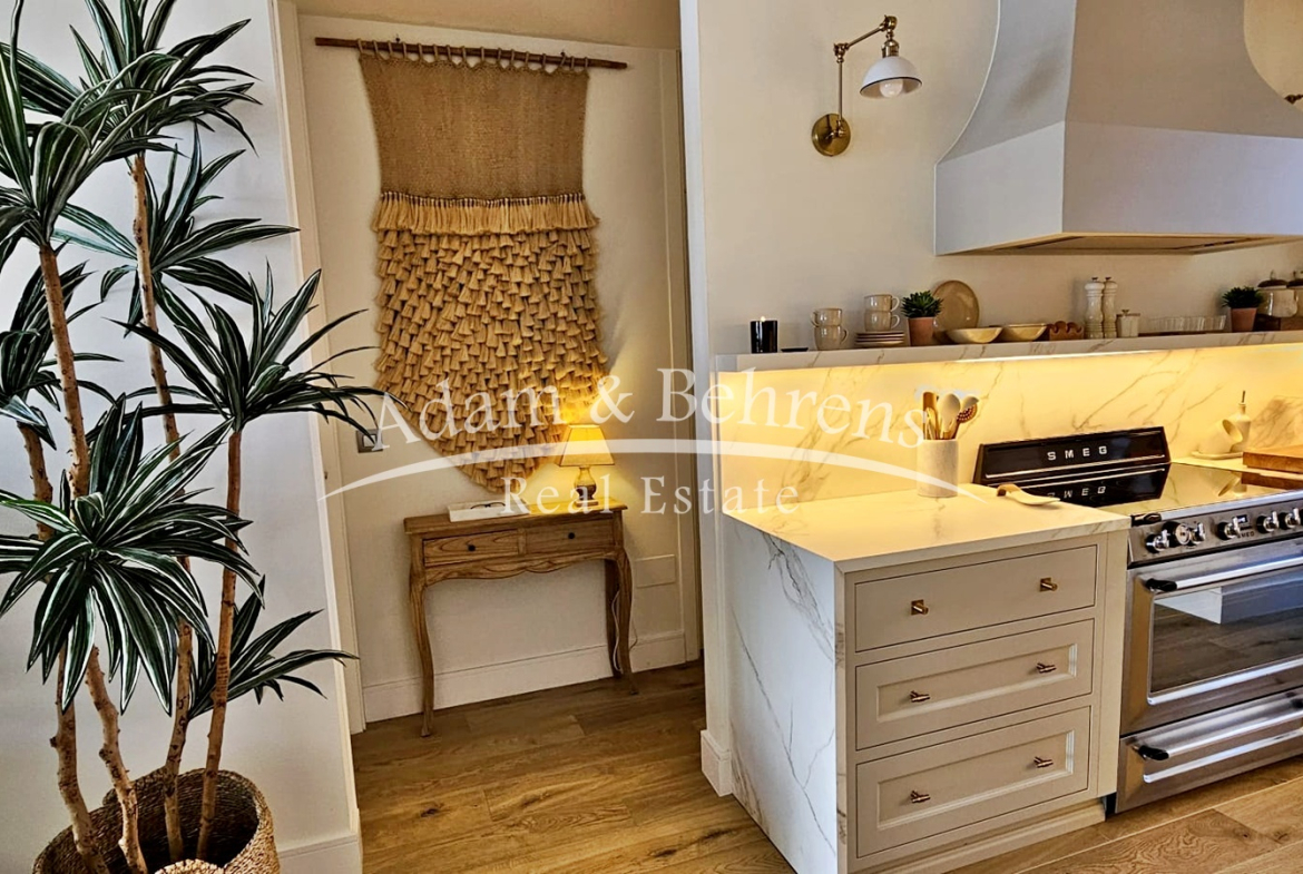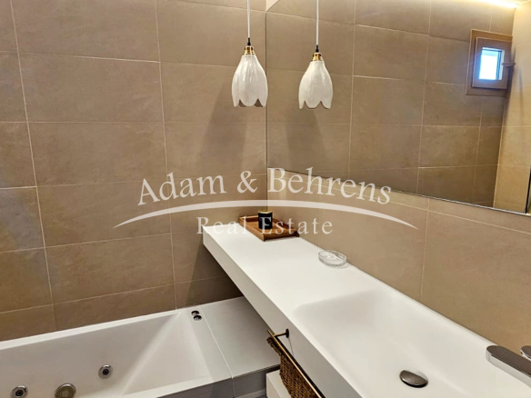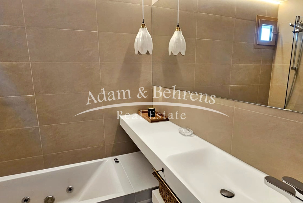Das Apartment bietet zwei Schlafzimmer, zwei elegante Badezimmer, einen großzügigen Wohn- und Essbereich sowie eine voll ausgestattete Designküche mit hochwertigen Geräten und edlen Materialien. Durch großflächige Schiebetüren lässt sich der Wohnbereich in eine offene Terrasse verwandeln – perfekt, um das mediterrane Lebensgefühl zu genießen.