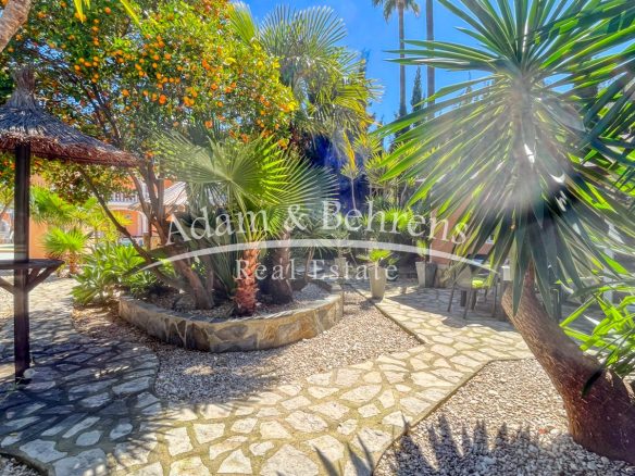 – Garten mit verschiedenen Ruhebereichen, mediterraner Vegetation, Teich und Vogelvoliere