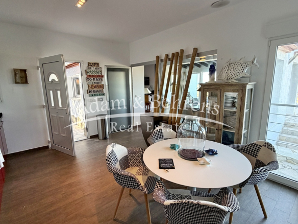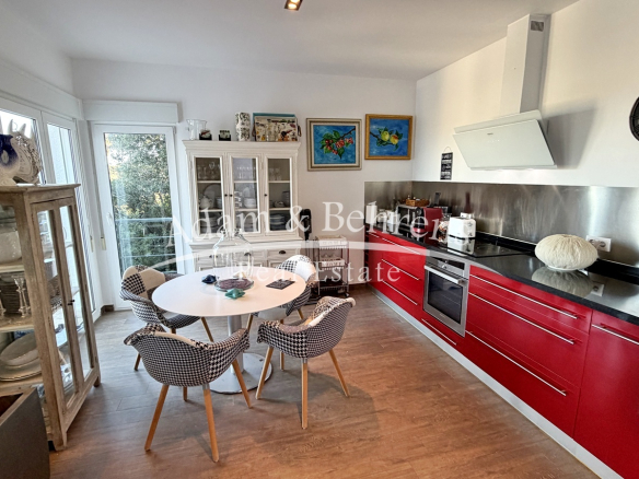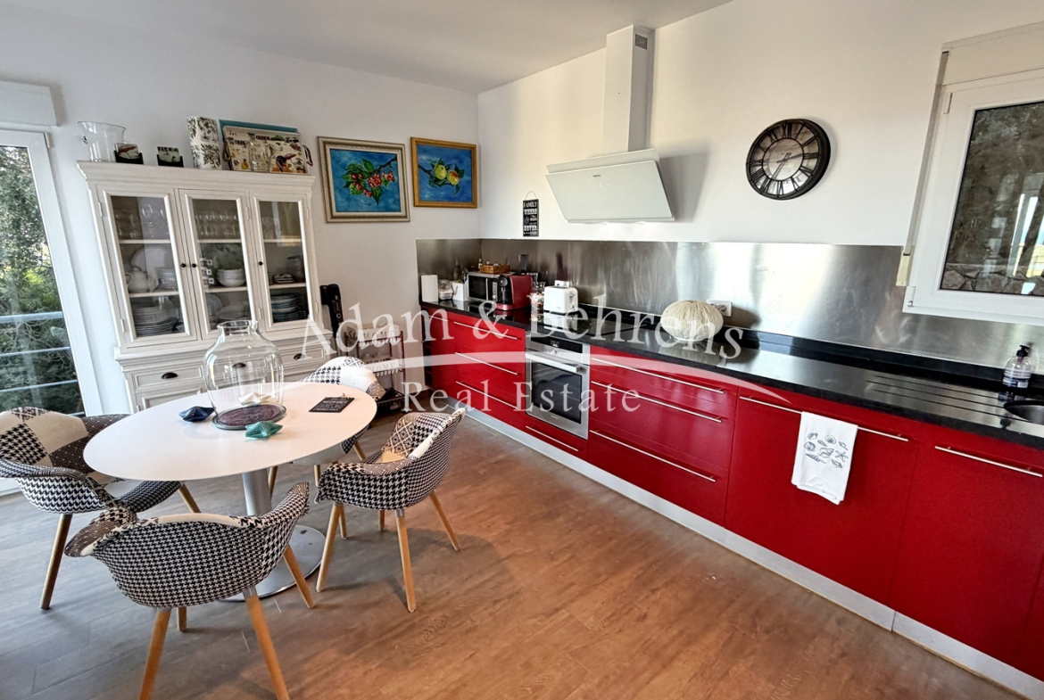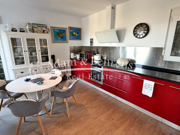 Zum Betreten der Villa stehen zwei Eingänge zur Verfügung – einer im Wohnbereich und einer in der Küche. Beide Bereiche sind durch eine Glaswand voneinander getrennt, was das offene Raumgefühl zusätzlich unterstreicht. Der großzügige Wohn- und Essbereich führt direkt auf die weitläufige Terrasse, die zum Genießen des Panoramas und des mediterranen Klimas einlädt. Über einen Flur erreichen Sie zwei Schlafzimmer und ein Bad sowie die Master-Suite mit eigenem Badezimmer.
